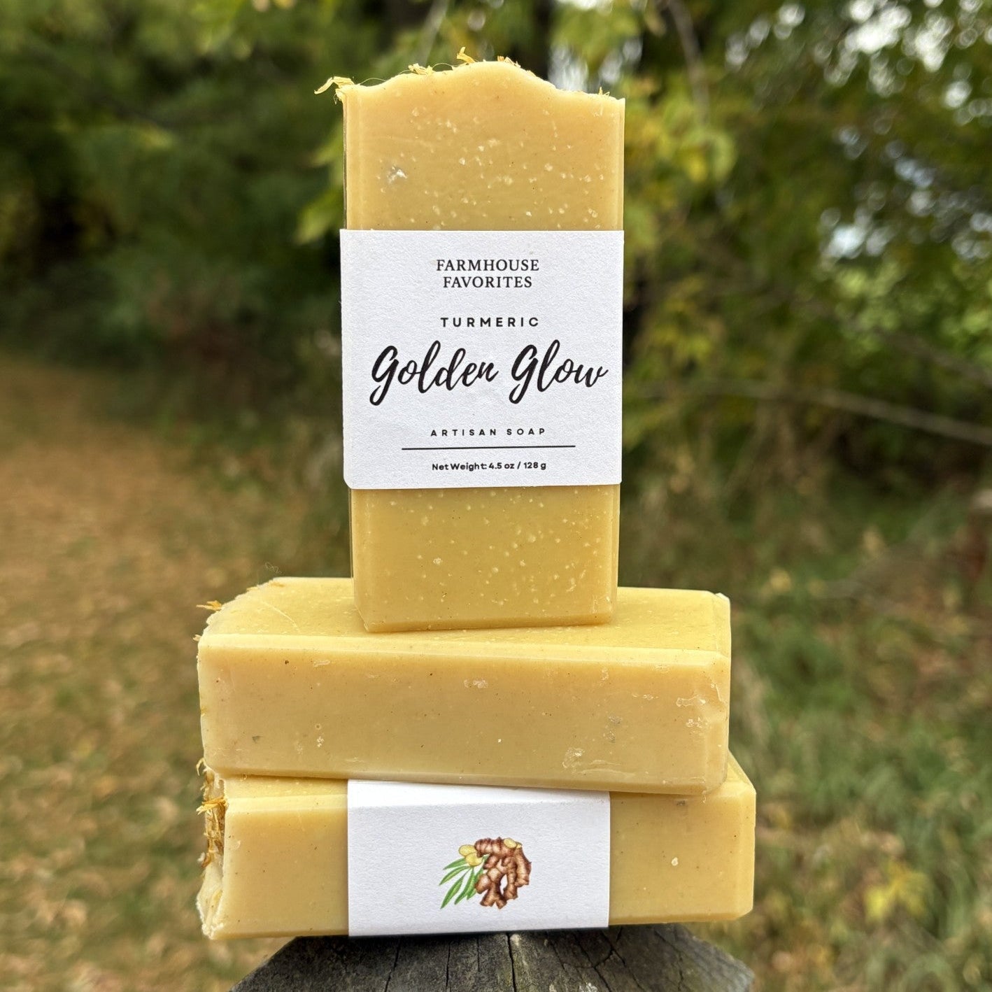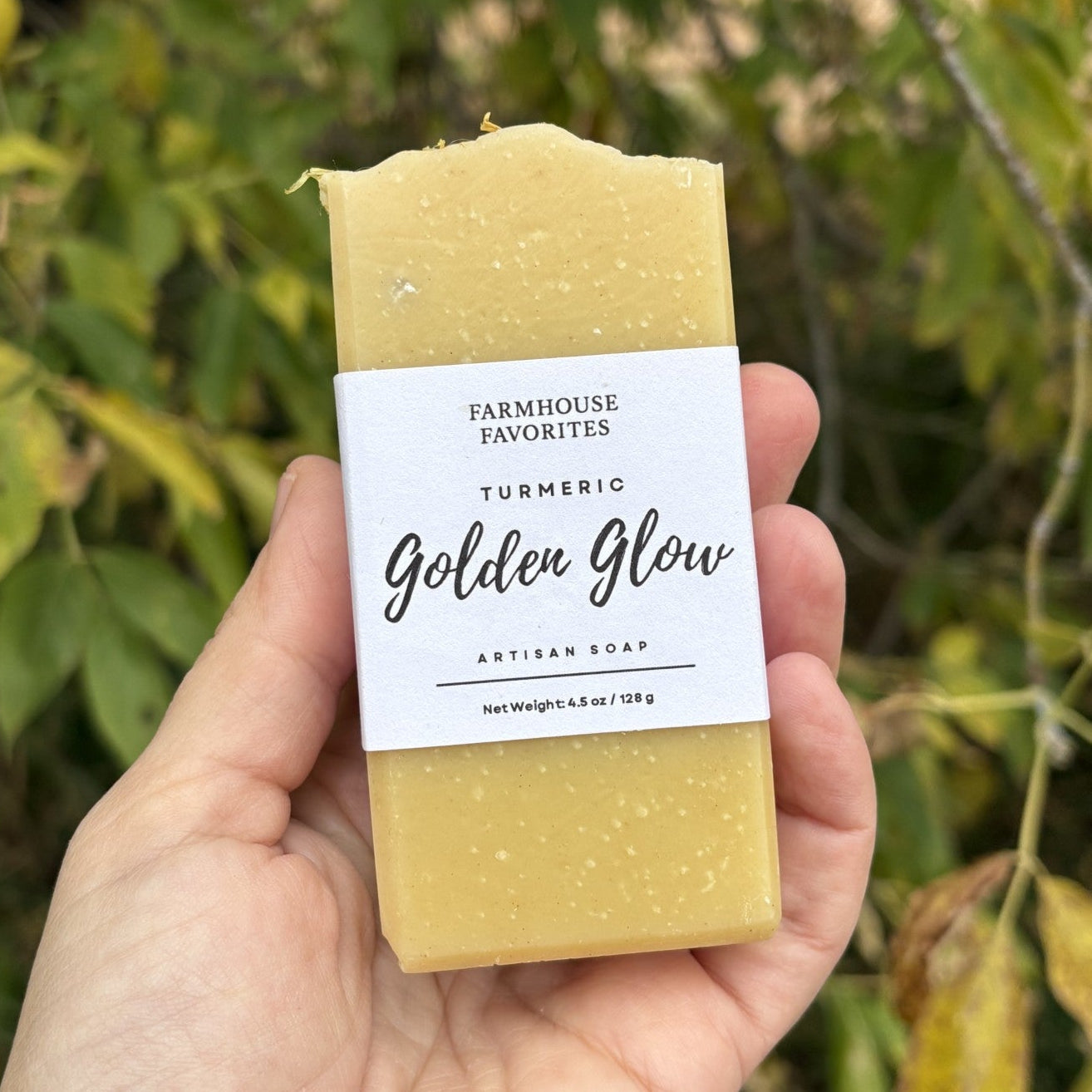 Bring a little sunshine to your skincare routine with Golden Glow, our naturally brightening turmeric soap crafted in small batches on our Wisconsin farm. This bar is designed to leave your skin feeling soft, refreshed, and radiant—thanks to the powerhouse pairing of turmeric powder and a vibrant citrus essential and fragrance oil blend.